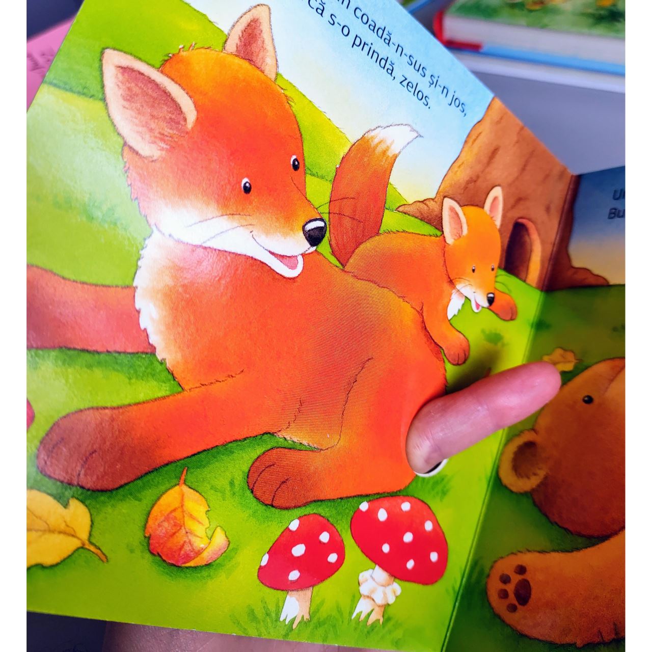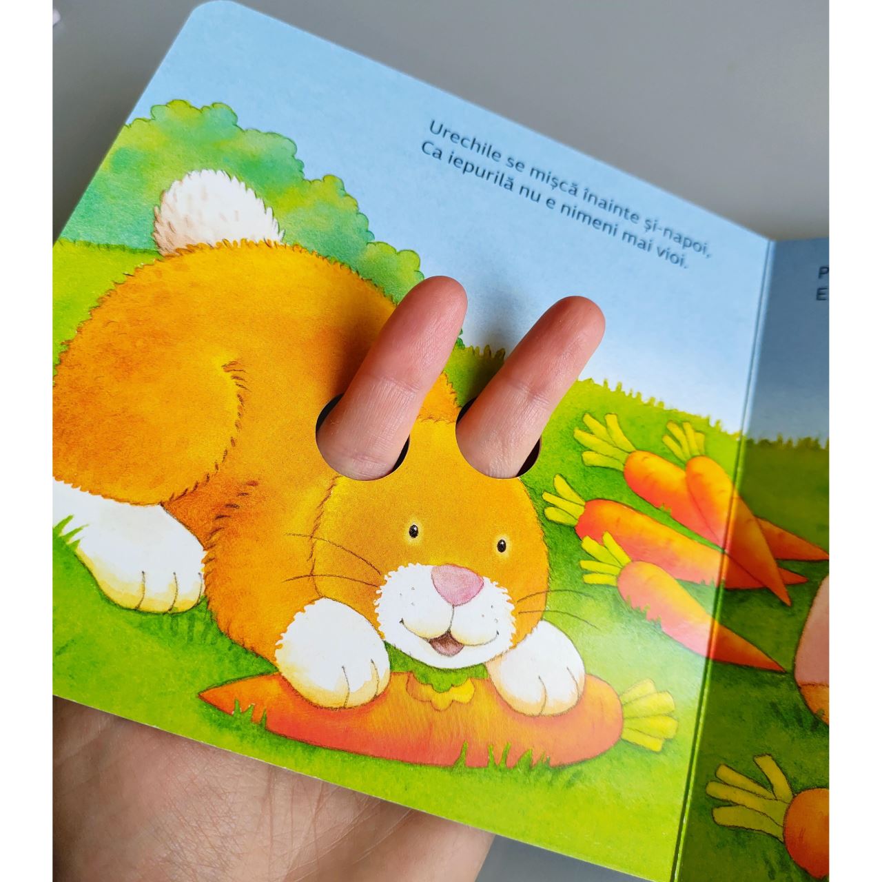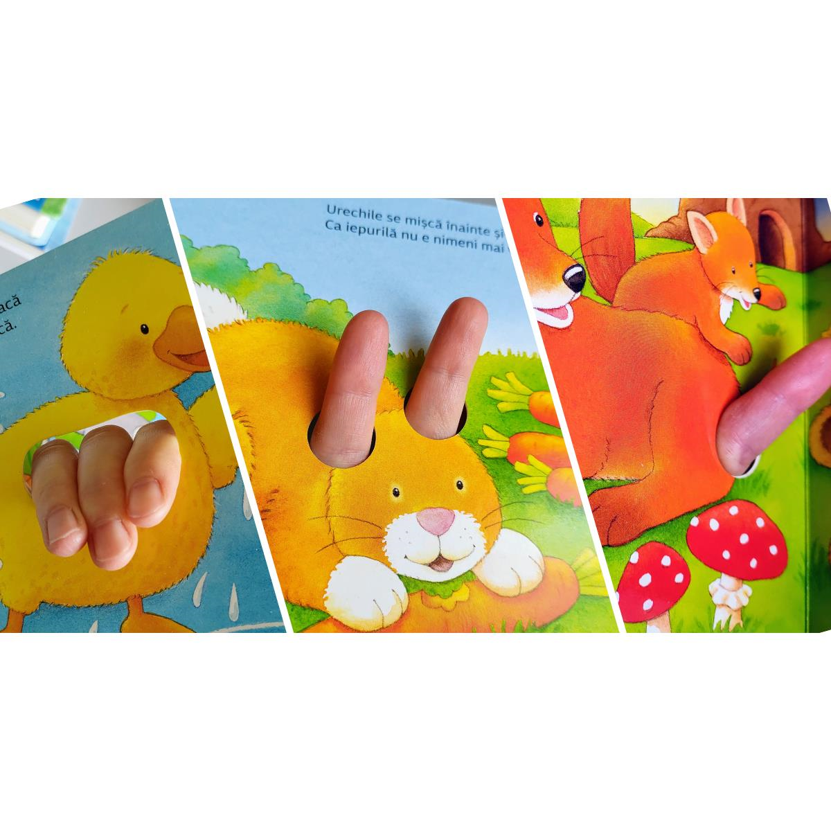 Dacă introduceți degețelele prin găurile perforate, cartea prinde viață: iepurele își mișcă urechile, omida se târâie peste paie și cârtița mică sare din mușuroi în mușuroi.