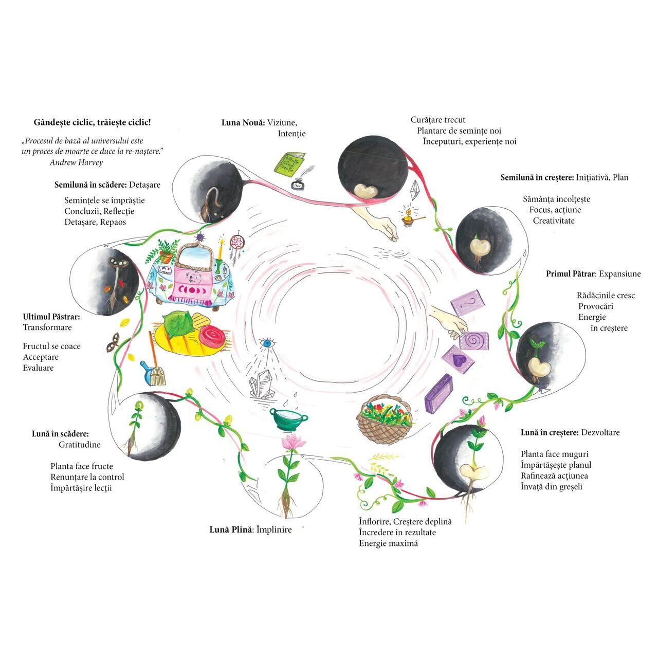 Jurnal de artă, caiet de practică feminină și agendă nedatată ce aduce susținere și spațiu de reflecție pentru conștientizarea vieții ciclice în corp de femeie pentru 13 cicluri lunare/menstruale.