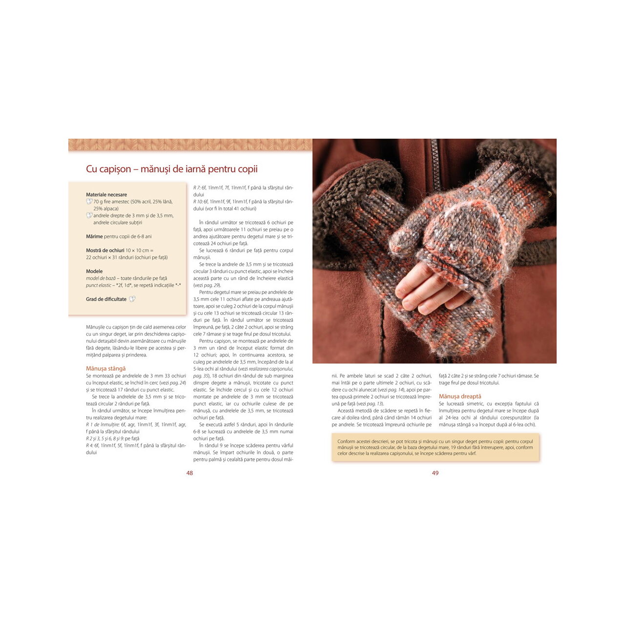 Cartea cuprinde explicaţia principalelor tehnici de tricotat şi 14 modele de mănuşi pentru întreaga familie.
